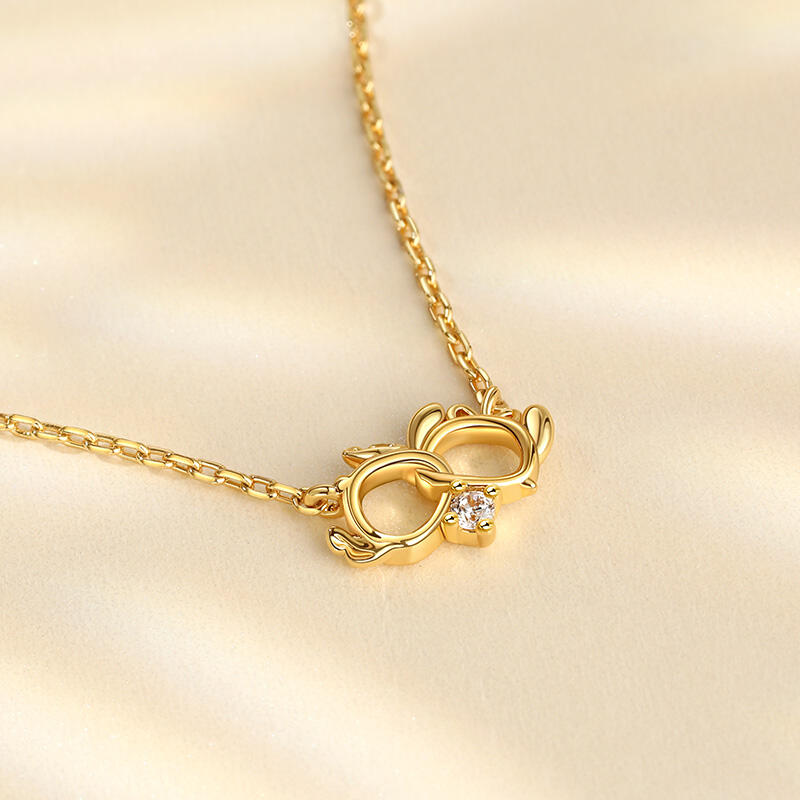 This enchanting pendant features two adorable little monsters, connected head to head in a playful embrace. Their mischievous expressions and quirky details bring a sense of whimsy and charm to the piece, making it a delightful addition to any jewelry collection. Beneath their intertwined forms, a small white stone is inlaid. This stone, like a star in the night sky, adds a touch of mystery and romance to the pendant, making it a perfect token of affection.
