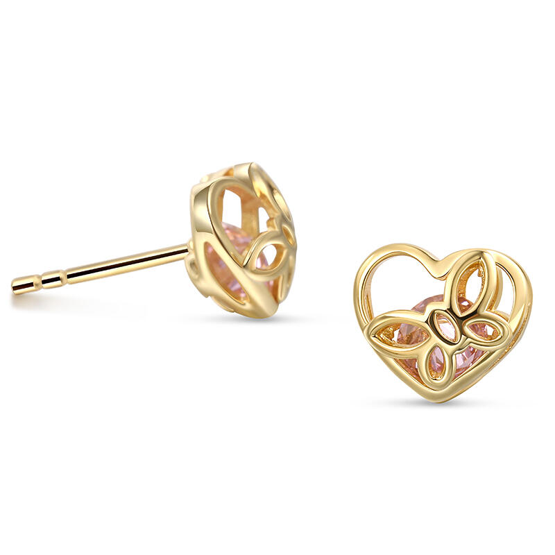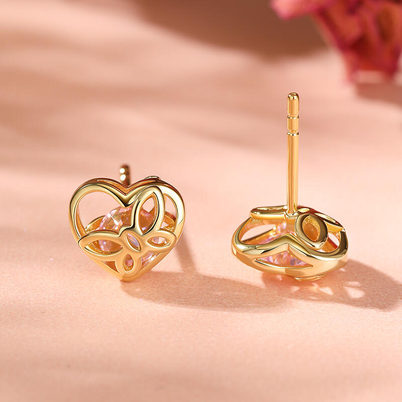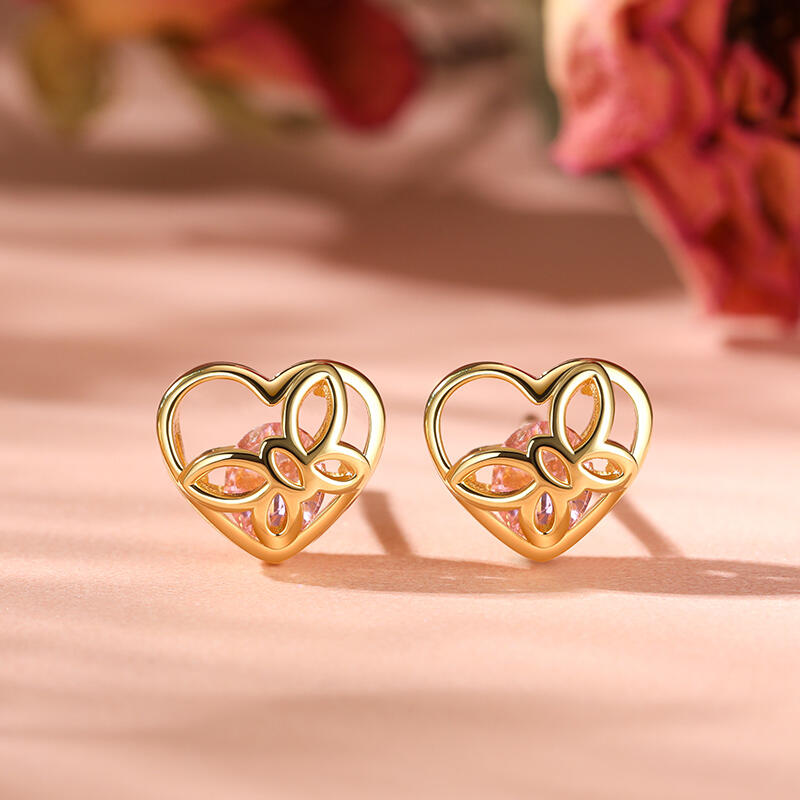 Each earring is a testament to beauty, featuring a heart-shaped body with a delicate butterfly pattern, allowing glimpses of the wearer's own radiance to shine through. Nestled within is a gleaming pink stone, adding a touch of enchantment. They are tokens of affection, sure to light up your world with their sparkling charm. Wear love on their ears, a reminder that beauty lies in every detail.
