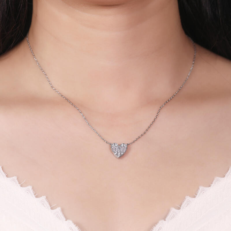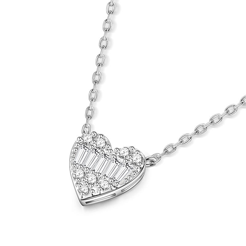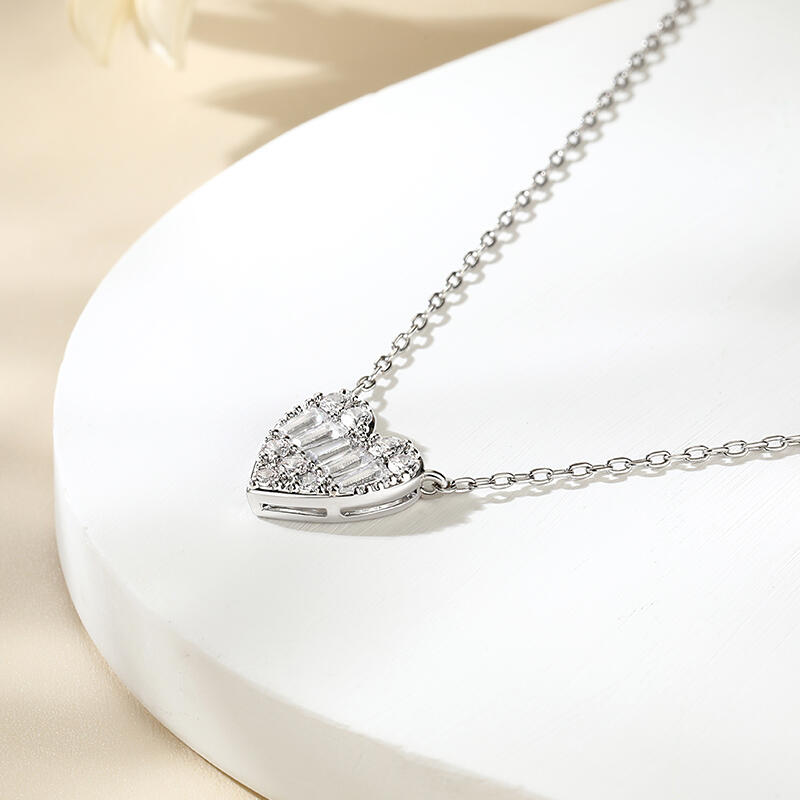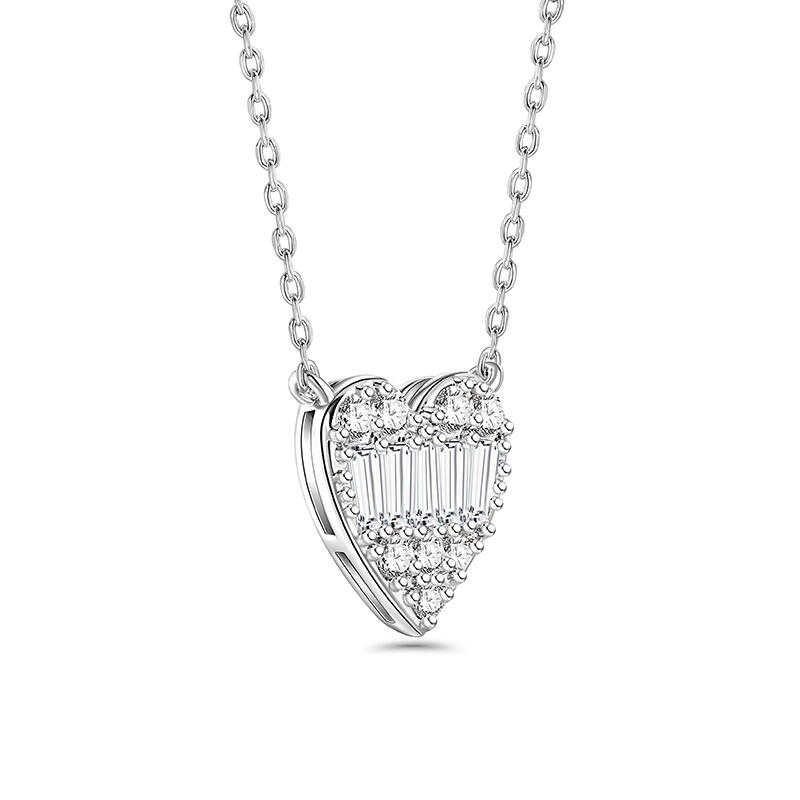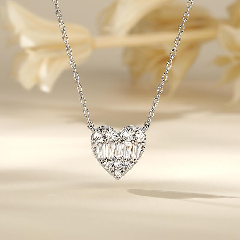 The "Pure Love" heart-shaped sterling silver necklace is a timeless token of affection, designed to captivate with its simplicity and elegance. The heart is crafted with precision, adorned with a sparkling array of round-cut and tapered baguette-cut stones. The stones catch the light, dancing and shimmering. It glimmers with a soft sheen, adding a touch of elegance to any ensemble. It is a symbol of pure, unwavering affection, perfect for any occasion that calls for a heartfelt expression of sentiment.