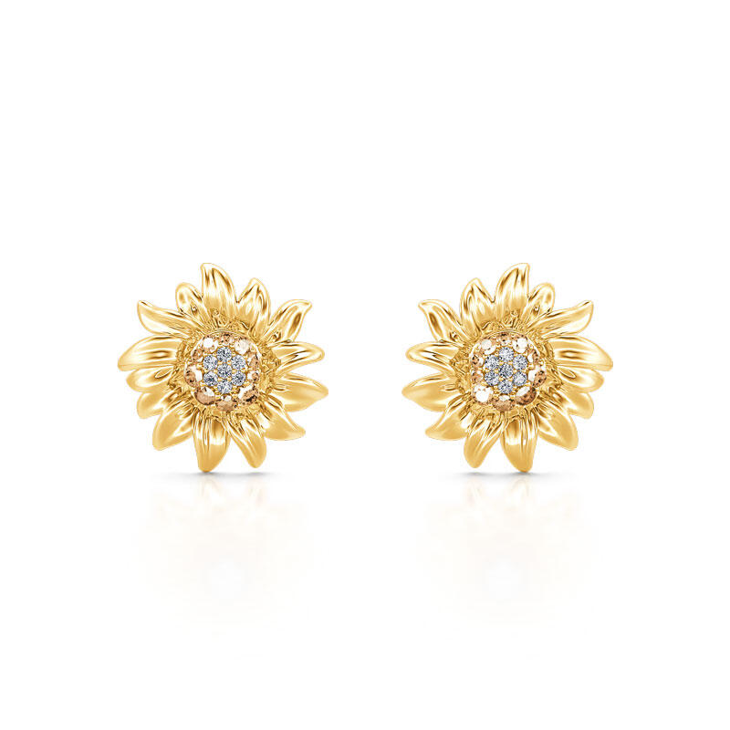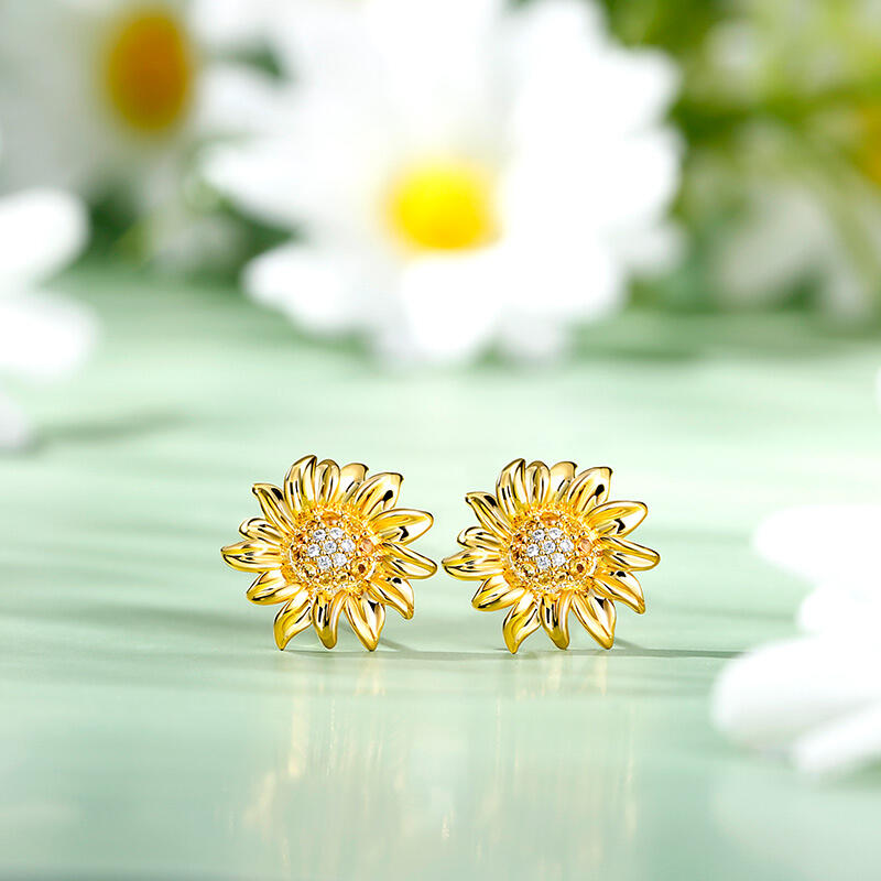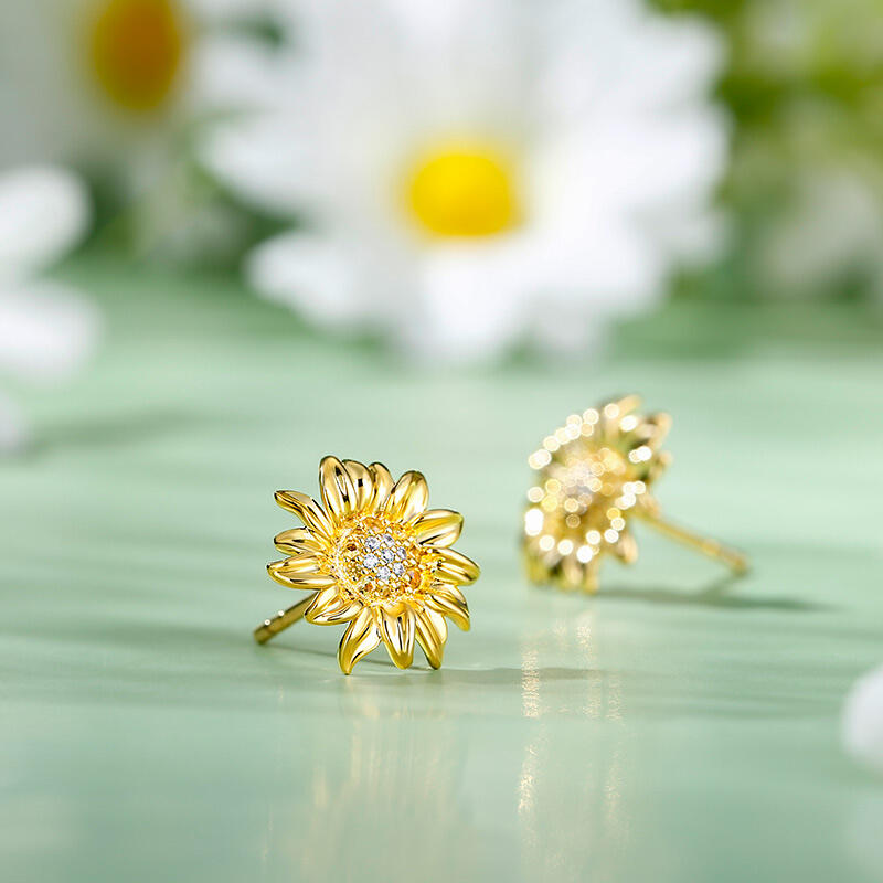 The sunflower with its beautiful fluttering petals and contrasting colors reminds us of summer sun and happy times. In this jewelry set we have chosen to focus on the flower's built-in contrast. We do this by placing a multitude of small brown and white stones in the center and letting them play up against a wreath of curved gold leaves. The beautiful sunflower design is sure to brighten up any outfit, and the quality materials make it perfect for everyday wear.