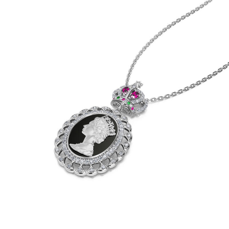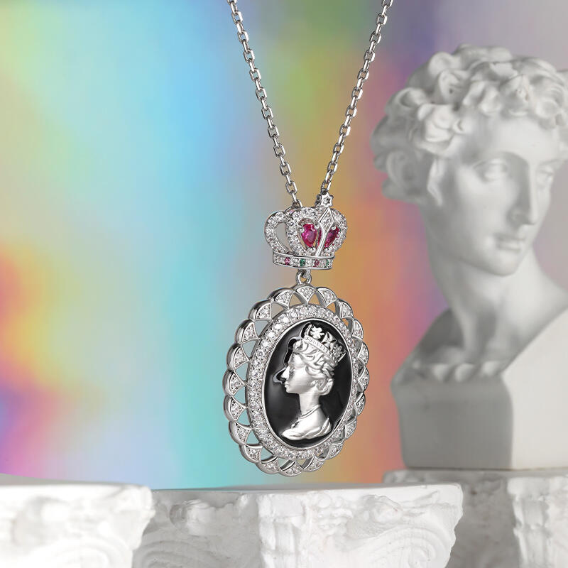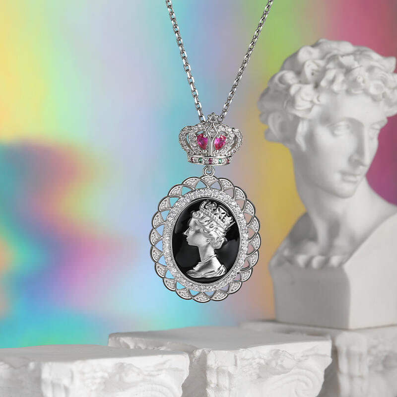 This beautiful necklace is made of 925 sterling silver and has a black enamel center and the Queen Elizabeth portrait. The beautifully detailed necklace highlights a large, enameled portrait cameo of a woman. Queen Souvenir Gift Necklace is designed in honor of Queen Elizabeth II, expressing your grief over the loss of a beloved monarch, sharing the grief with your friends and family.