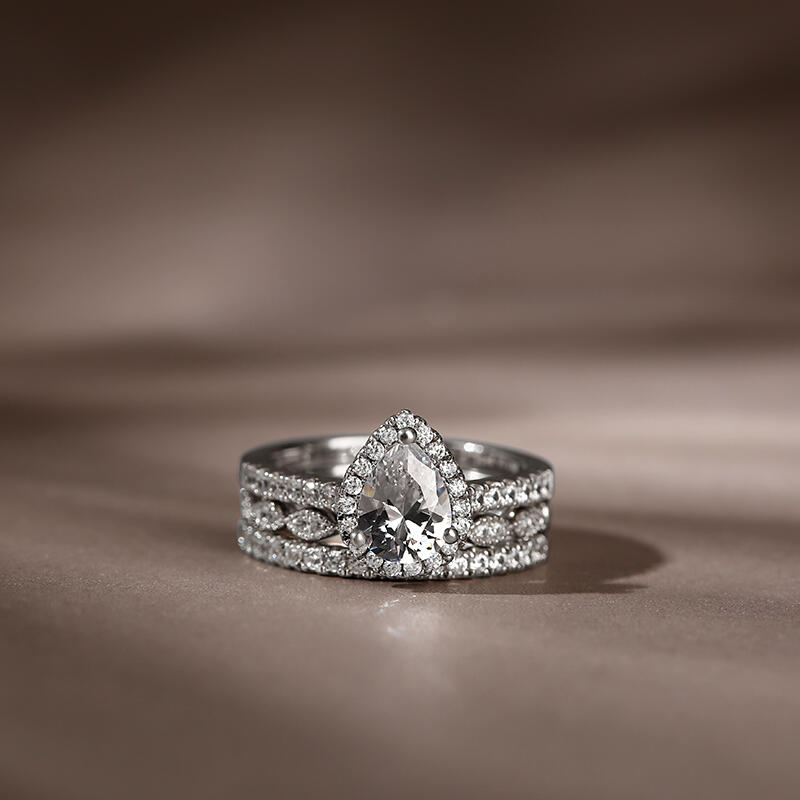 This lovely look showcases a pear-cut center stone wrapped in a frame of rounds stones. On your special day, a pair of coordinating wedding bands - one decorated with marquise-shaped designs while another decorated with round stones - completes this fabulous art deco-inspired ensemble. This bridal set celebrates every chapter as your unique journey of love unfolds.