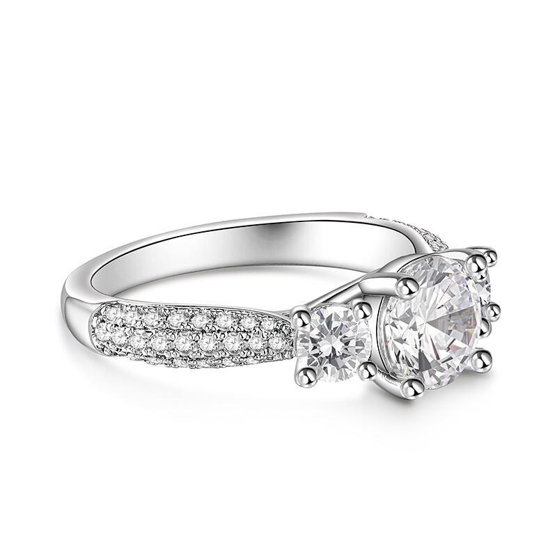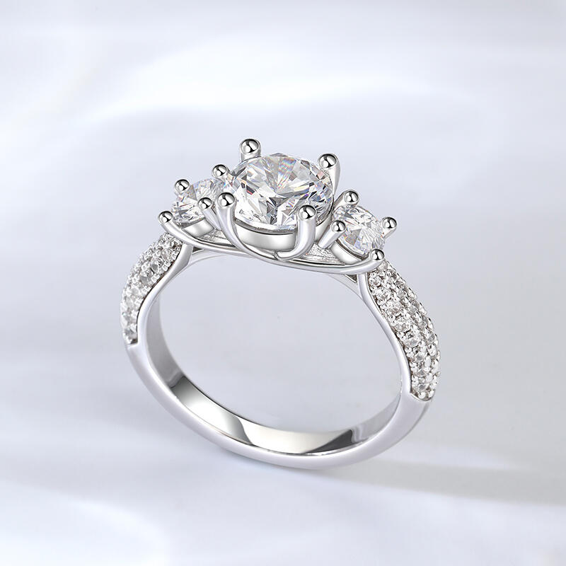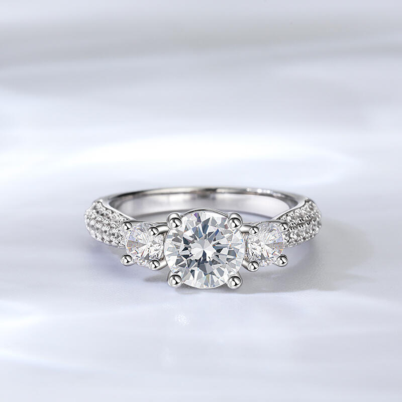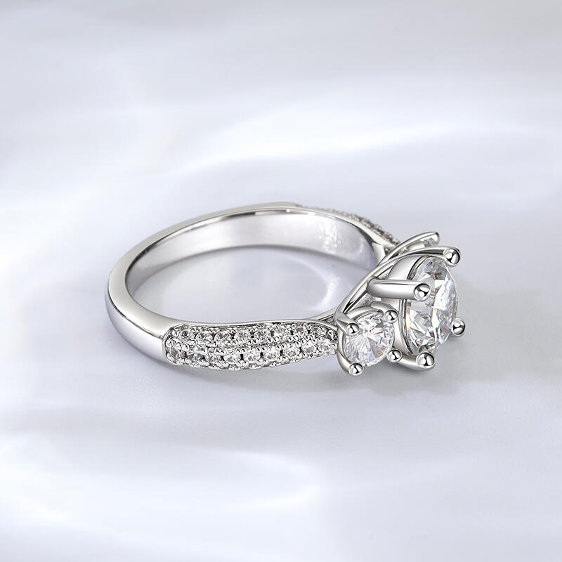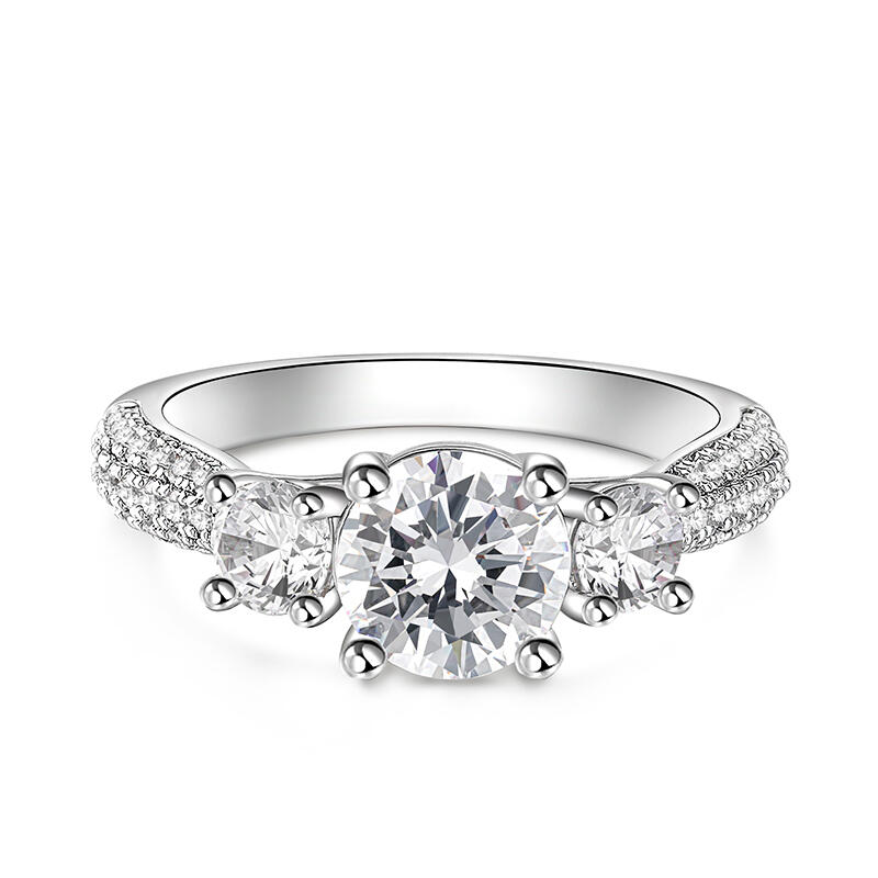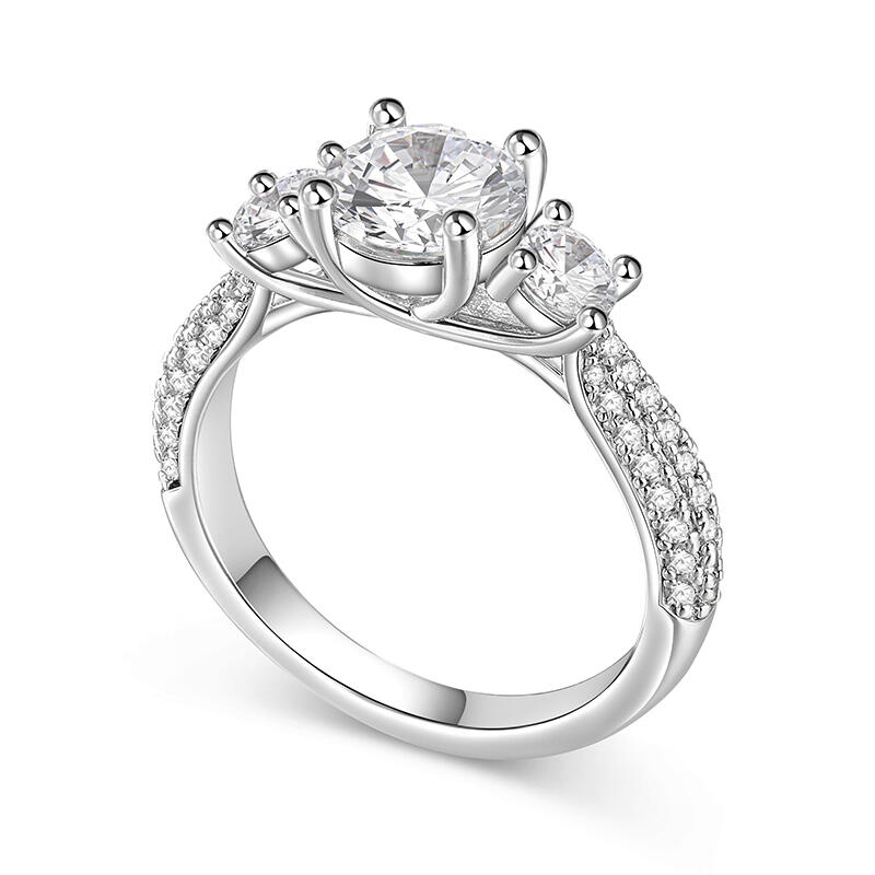 This three-stone round cut engagement ring is a timeless symbol of love and commitment. The center stone, sparkling with brilliant clarity, is flanked by two smaller stones, creating a captivating trio that draws the eye. The round cut of each stone allows for maximum light refraction, ensuring they shine brightly from every angle. This ring is a perfect choice for those seeking a classic yet eye-catching engagement ring that will stand the test of time. Whether worn as a daily reminder of your love or for special occasions, this ring is sure to be a cherished keepsake.