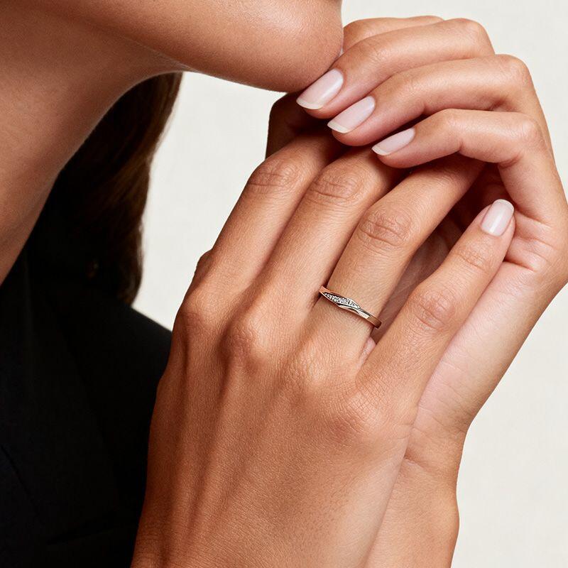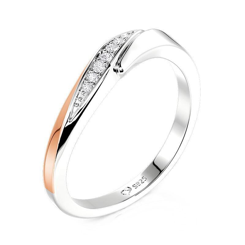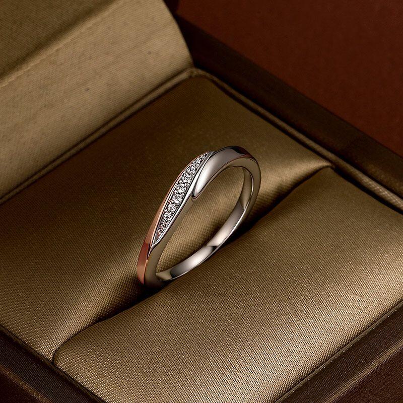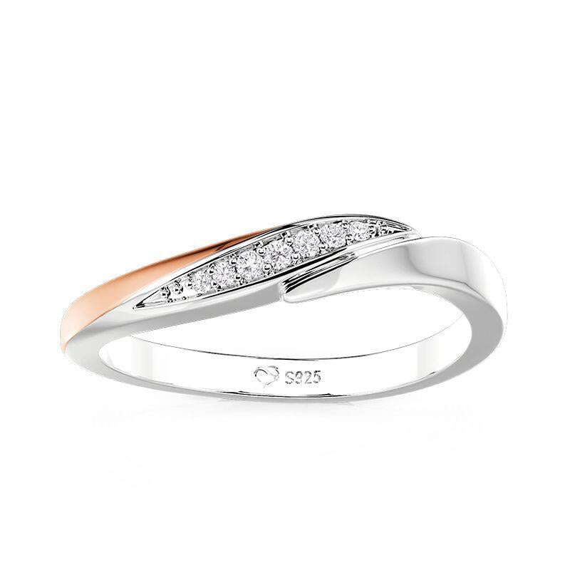 Celebrate soft sophistication with the Jeulia curved twisted two-tone women's wedding band. This design features a sleek twisted band that blends polished silver and warm rose gold, accented by a row of sparkling stones along the curve. The two-tone finish adds subtle depth, while the curved silhouette ensures a comfortable, elegant fit. This simple wedding ring balances modern twist detail and delicate sparkle, making it a perfect wedding band or daily accessory that wraps your finger in refined, two-tone charm.
