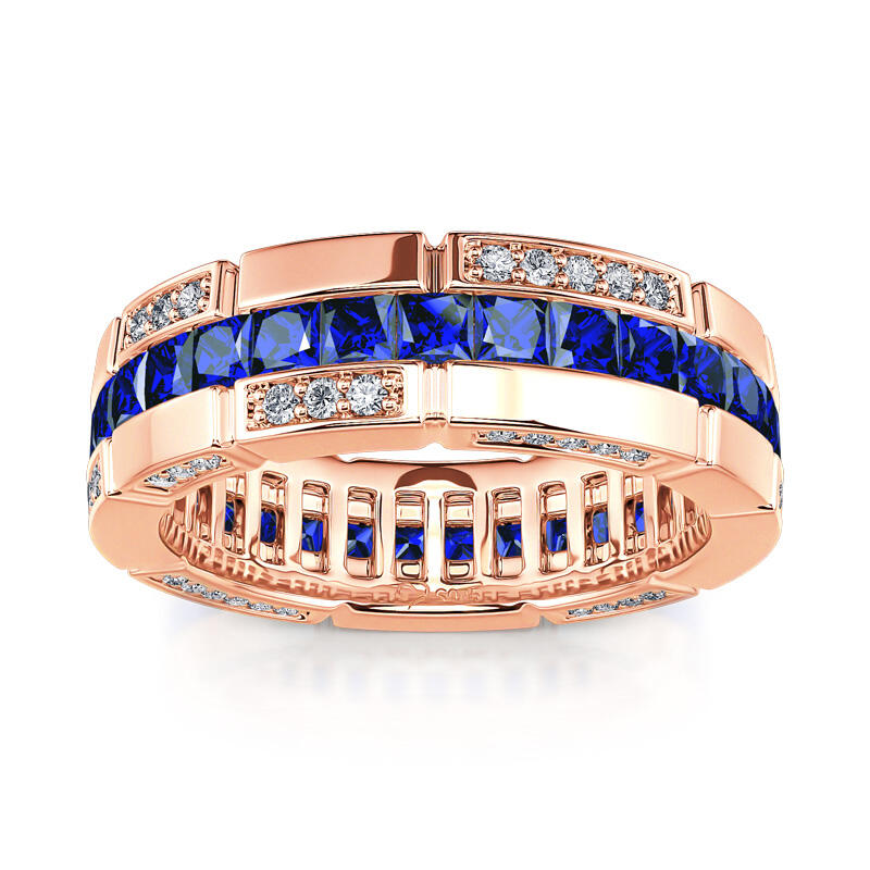 Celebrate your everlasting love story with this elegant eternity band that represents an eternity of love. Designed in rose gold color, a row of sparkling fuchsia princess cut stones are channel set across the center of this band. Borders of smaller round stones grace the band, completing this exceptional design. This band is a beautiful reminder of your timeless romance.