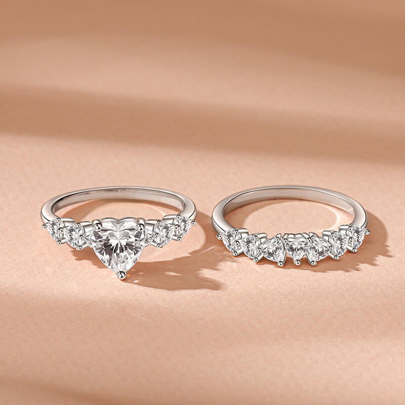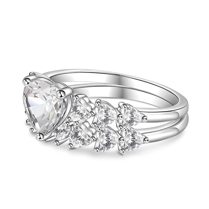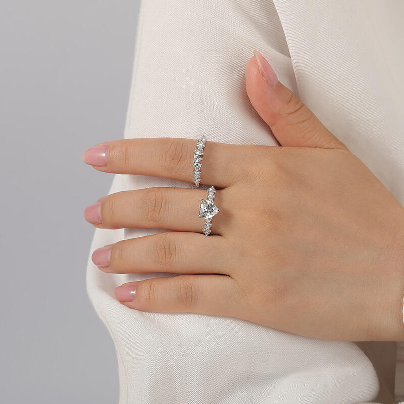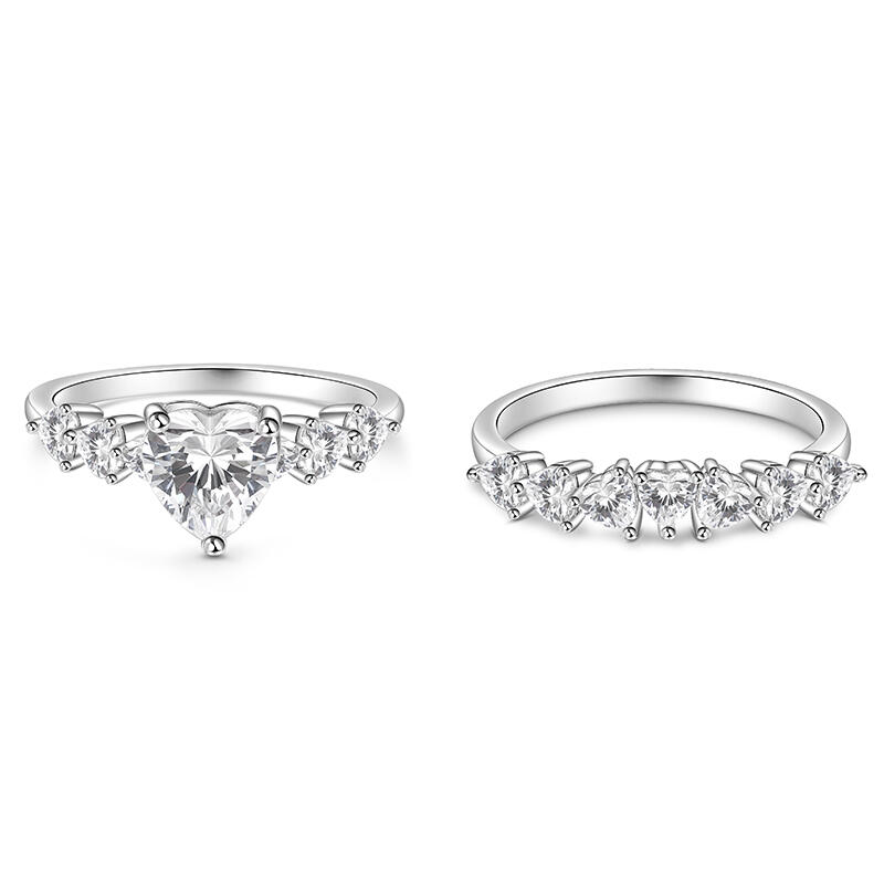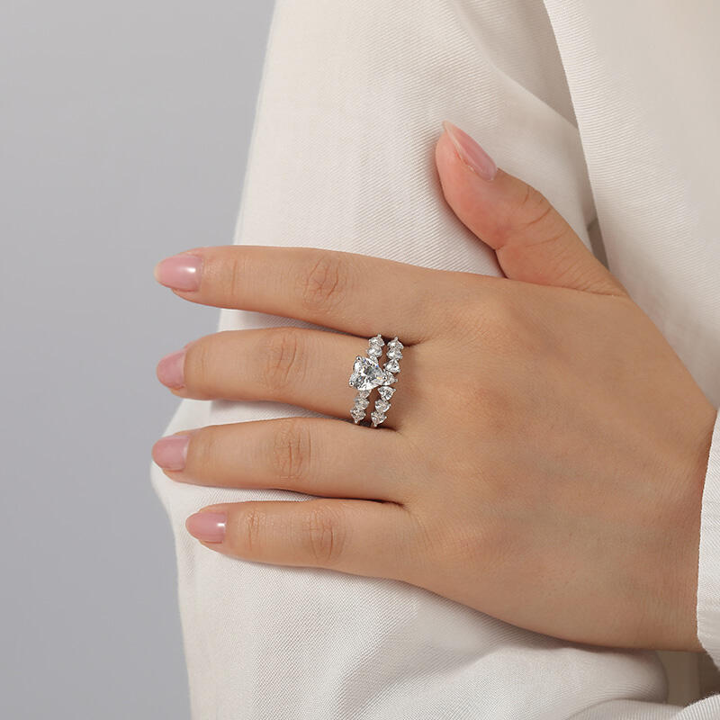 Crafted in sterling silver, this classic heart engagement ring set features a sparkling heart-shaped main stone on the main ring, symbolizing deep love. The heart-shaped stones are also set on the arms of the main ring and the secondary ring, as if to express the vow of being in each other's hearts and following each other's hearts. The “Heart to Heart” ring set not only witnesses the purity of love, but also signifies infinite mutual support and protection, becoming a witness of your love and a token of your lifelong adoration.