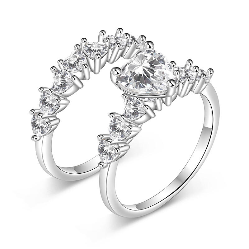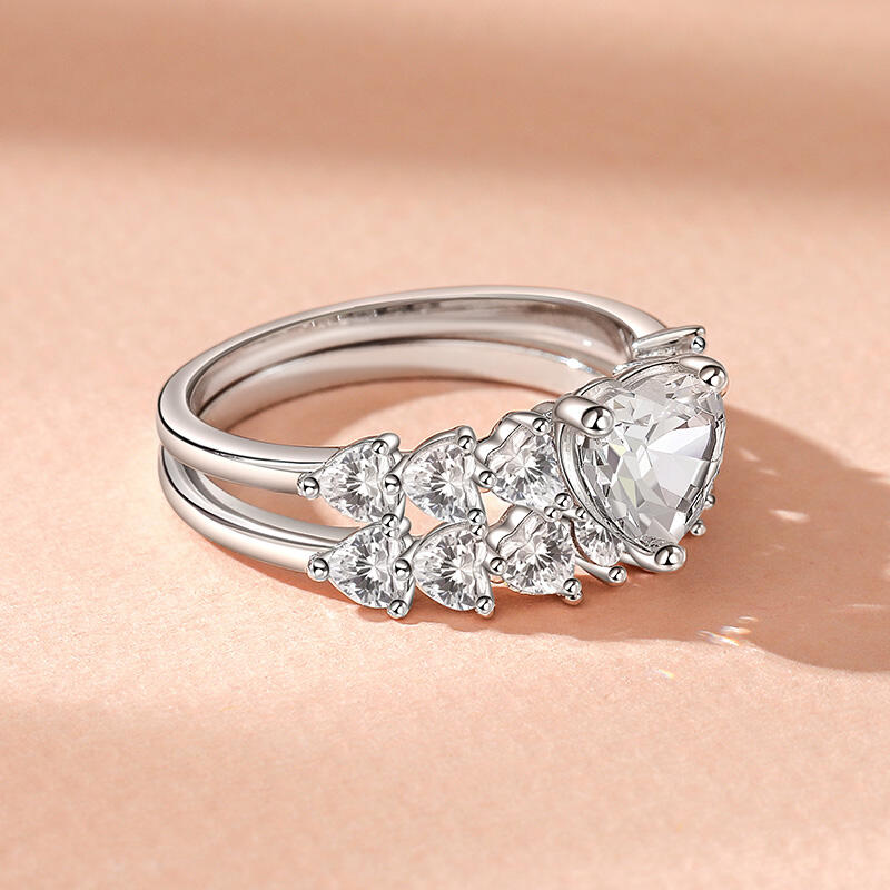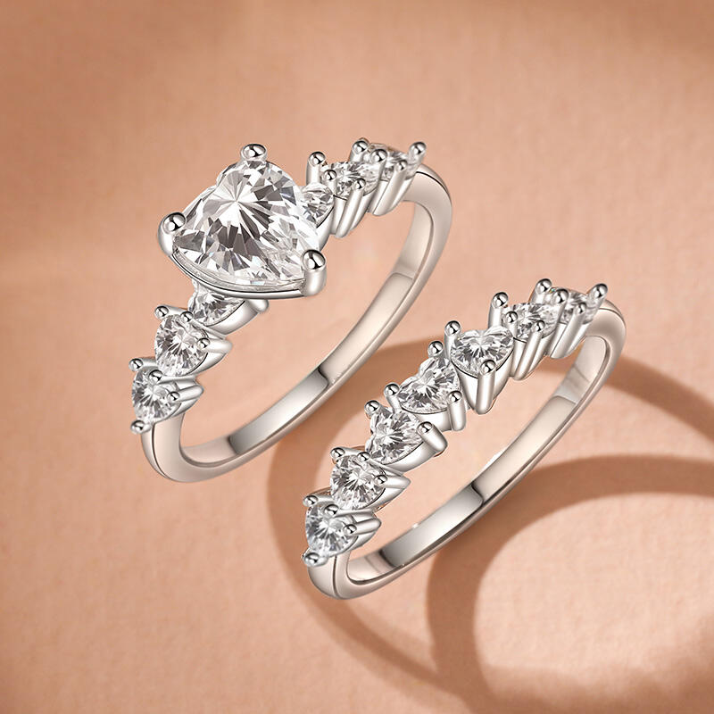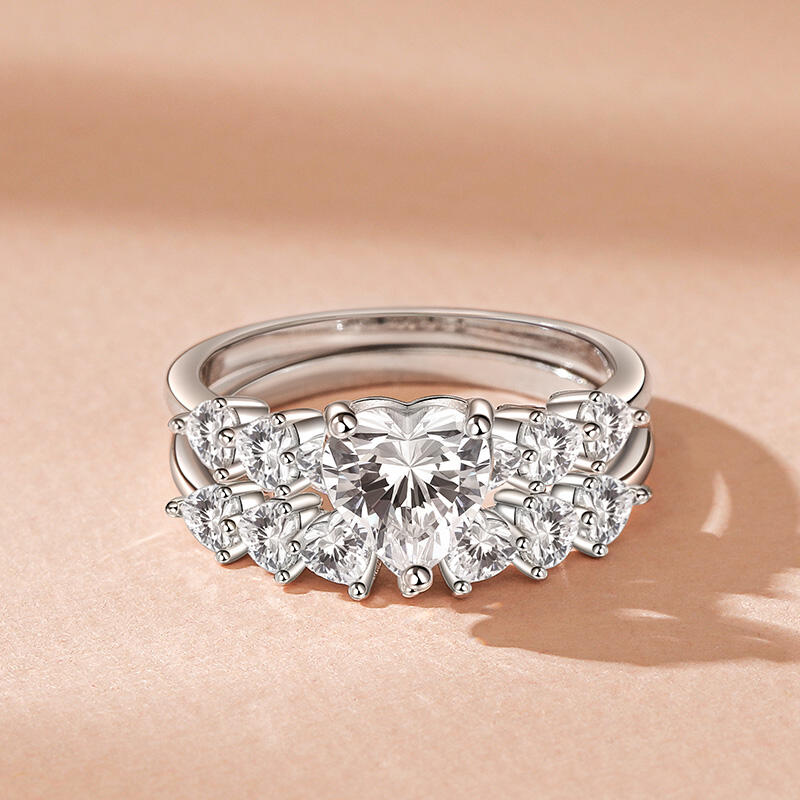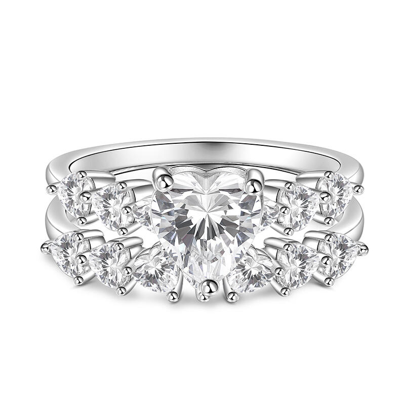Crafted in sterling silver, this classic heart engagement ring set features a sparkling heart-shaped main stone on the main ring, symbolizing deep love. The heart-shaped stones are also set on the arms of the main ring and the secondary ring, as if to express the vow of being in each other's hearts and following each other's hearts. The “Heart to Heart” ring set not only witnesses the purity of love, but also signifies infinite mutual support and protection, becoming a witness of your love and a token of your lifelong adoration.
