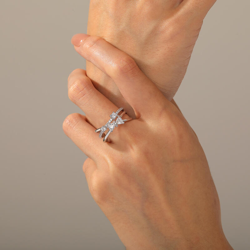 A silver ribbon twists through a pavé bow, creating an optical illusion of two rings dancing mid-embrace. The bow’s crystalline knots catch light like dew on spider silk, while the twisted band coils beneath it like a vine refusing to be tamed. No actual stacking required—this single interlocking ring layers romance and rebellion in one breathless silhouette. For the woman who knows elegance thrives in clever contradictions.