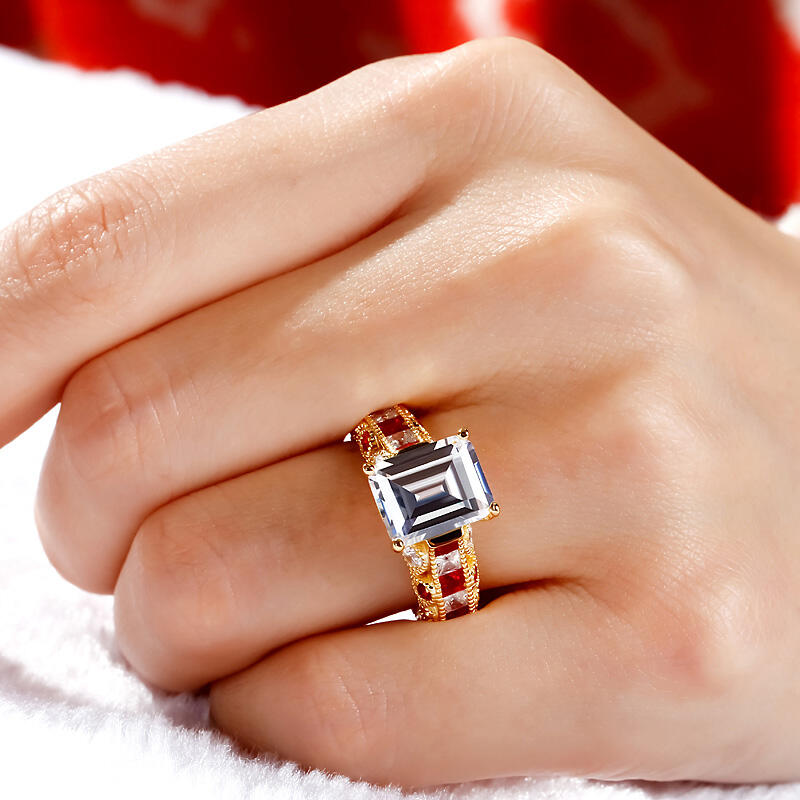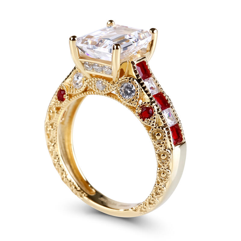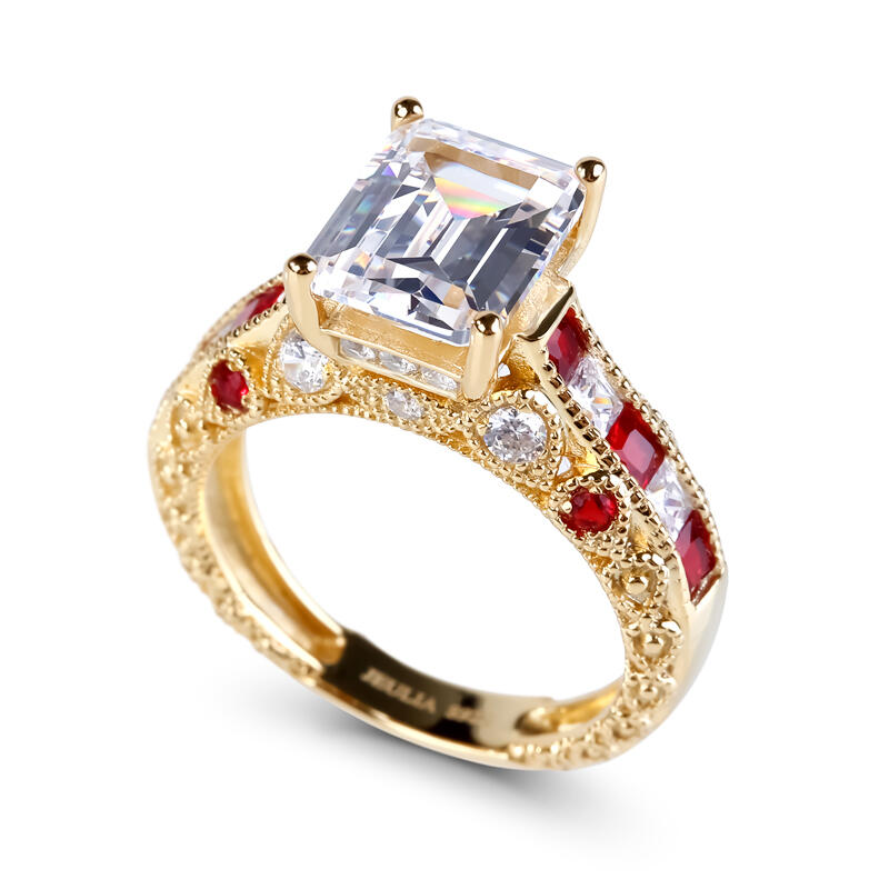 Luxurious and breathtaking, this engagement ring will capture your heart at first sight. Crafted in gold tone sterling silver, the ring features a large emerald-cut center stone and three-side paved stones on the shank, which makes the ring sparkle from every angle. Milgrain detailing adorns the ring to add elegance to it. Treat yourself or surprise her with this masterpiece!