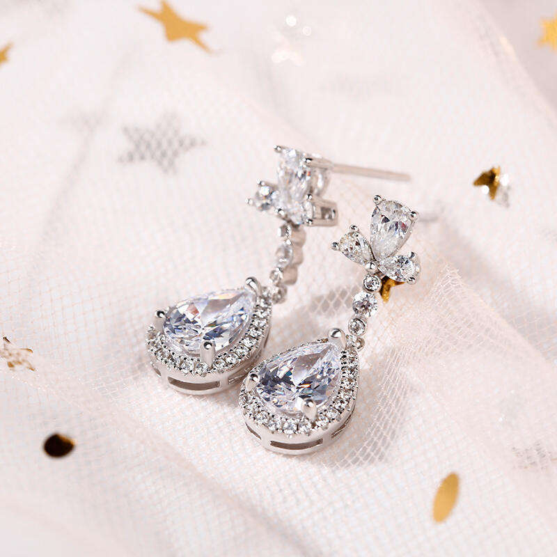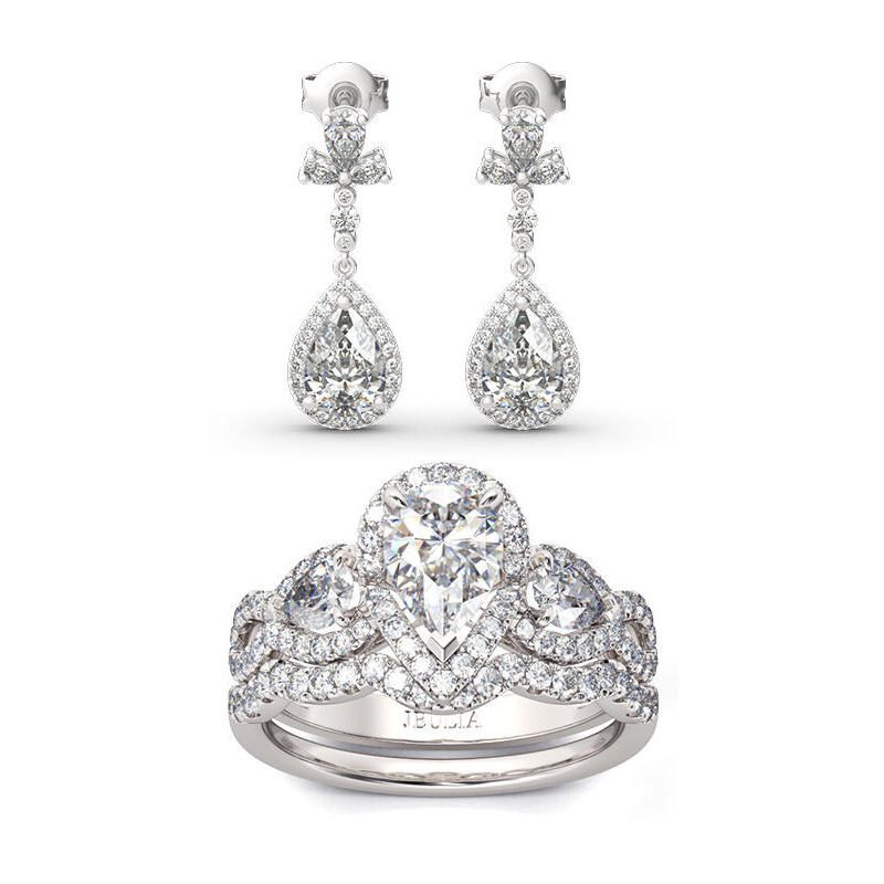 Celebrate one of the most unforgettable moments of your life with this joyous expression of love. Crafted in sterling silver, each jewelry features an pear-cut center stone wrapped in a halo of shimmering round stones, which shows a really exquisite look. Glittering in bold brilliance, additional stones add more sparkle. Treat yourself or surprise her with this jewelry set.