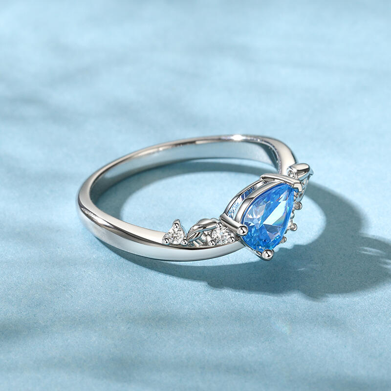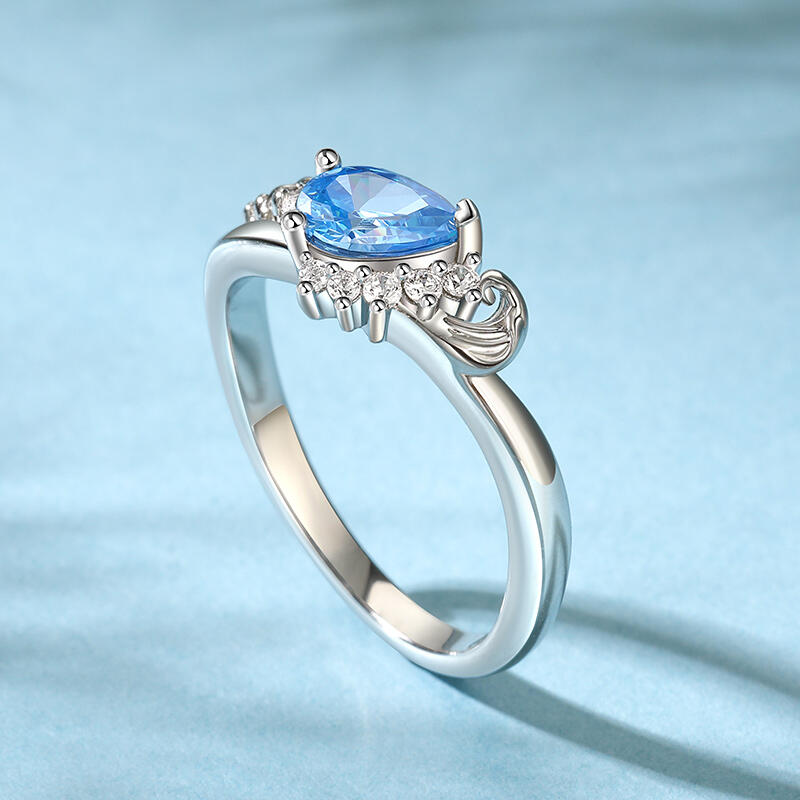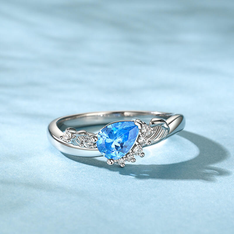 This sterling silver ring, adorned with the essence of the ocean, captures the essence of tranquility and majesty. At its heart lies an ocean blue pear-shaped stone, shimmering with a subtle wave pattern. This unique cut stone appears to be a frozen wave, capturing the essence of the sea's movement in a single moment. The ring's design is inspired by the undulating waves that lap against the shore, each curve and contour mimicking the graceful dance of the sea. The sterling silver band is sleek and polished, complementing the center stone perfectly. As it catches the light, the ring seems to come alive, as if the waves within it were truly moving.