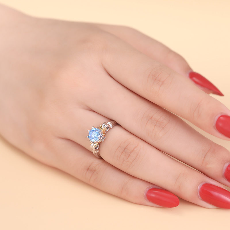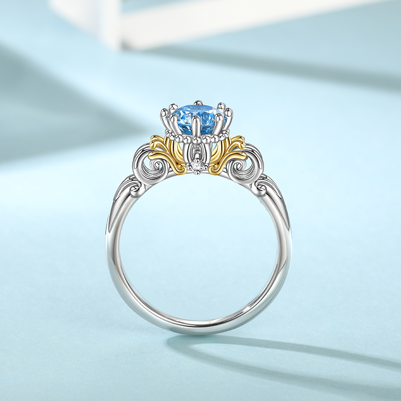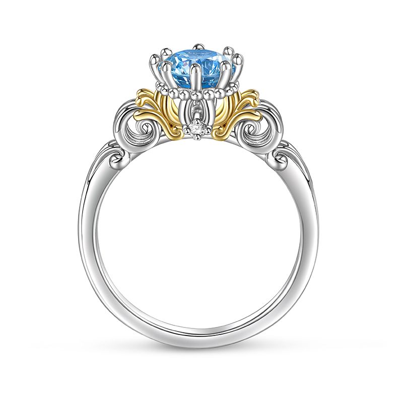 This enchance ring is a captivating ode to the fairytale romance of the princess and her pumpkin carriage. The intricate design of the ring's top, shaped like a charming pumpkin carriage, evokes a sense of whimsy and wonder. The centerpiece of this unique ring is a stunning blue round-cut stone, sparkling with the radiance of stars. This stone, like the love it symbolizes, is both deep and enduring, reflecting the infinite beauty and strength of true affection.