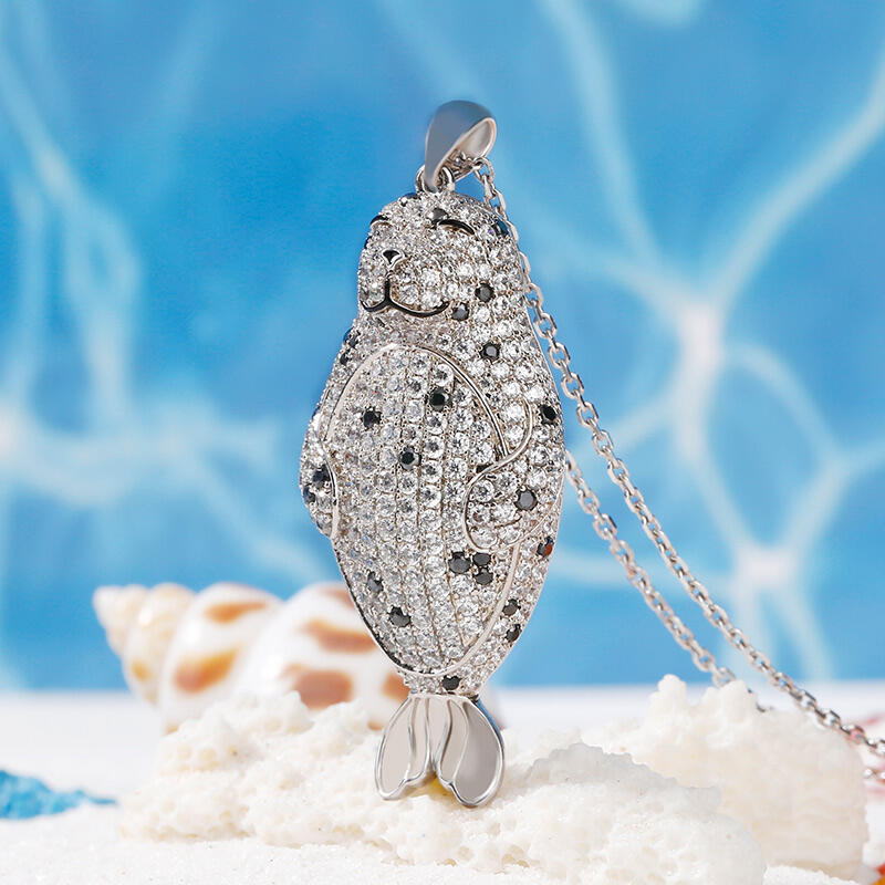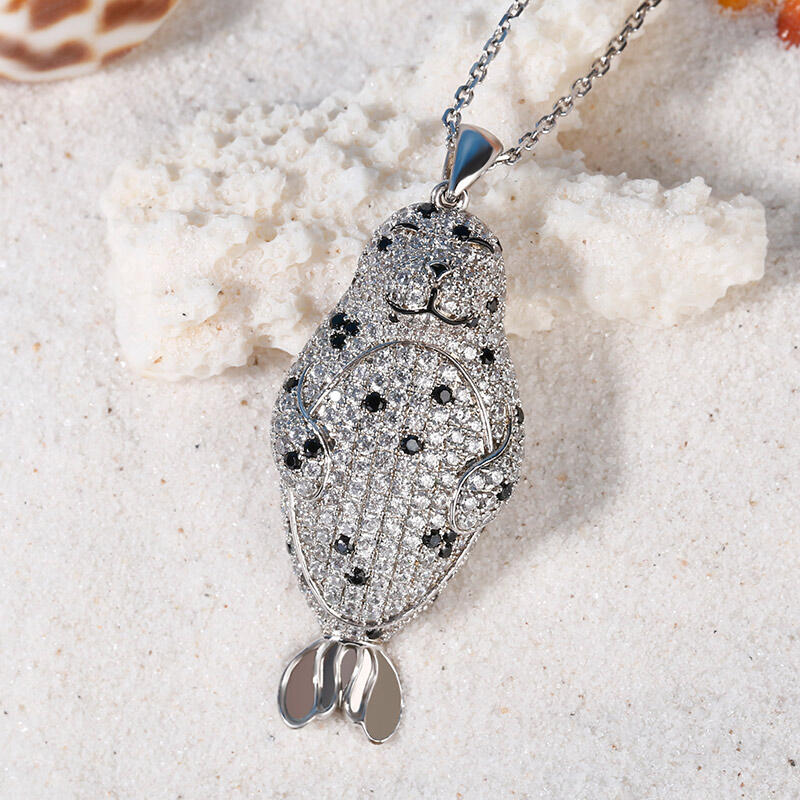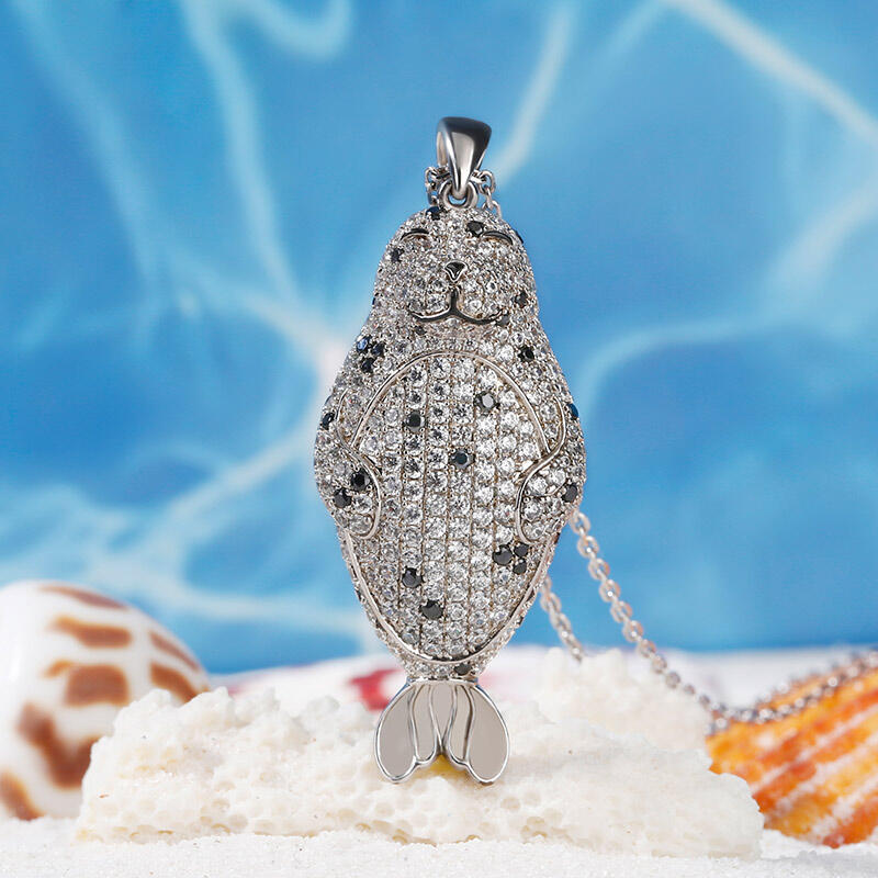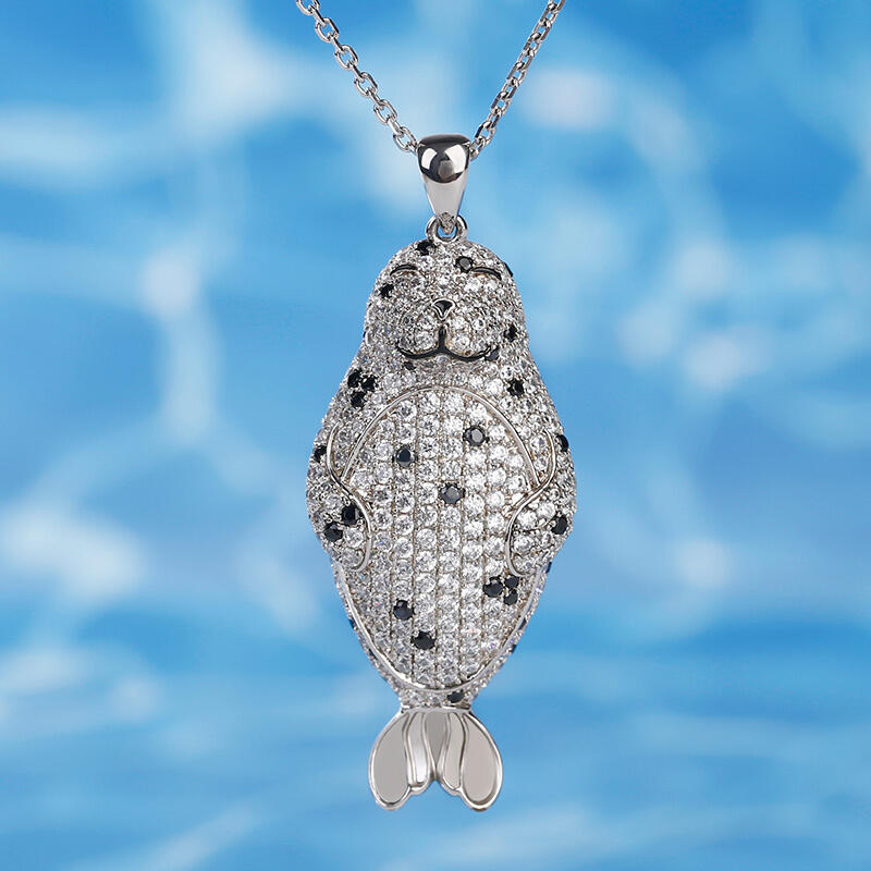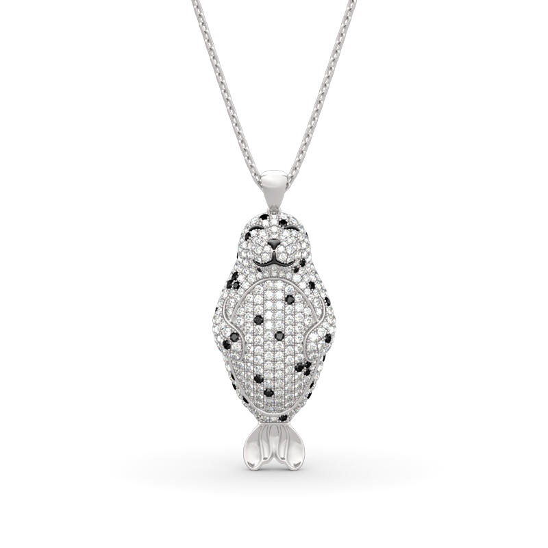 A beautiful adornment for any occasion, this traditional seal pendant is simply exquisite. Crafted in sterling silver, this glittering necklace showcases a seal adorned with sparkling white stones and decorated with black stones that is unique and will add a lifelike look to your jewelry. Treat yourself or surprised her with this masterpiece!