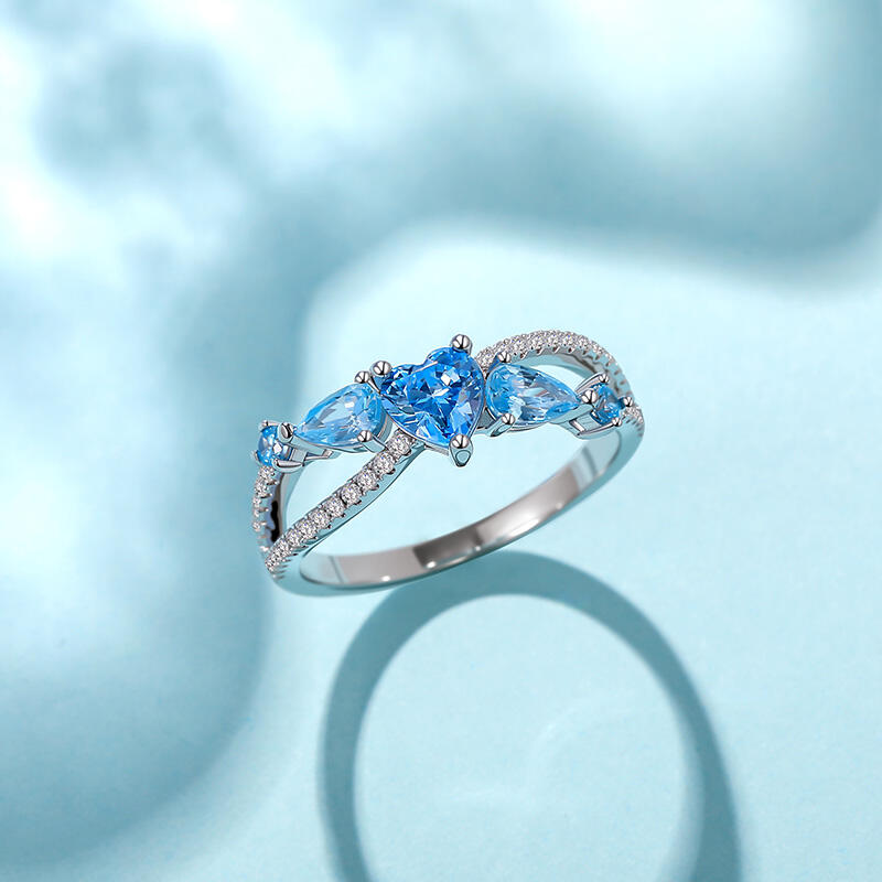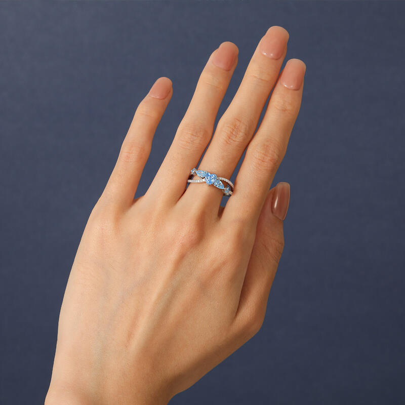 Inspired by the depths of the ocean, this Jeulia twist multi stone aquamarine infinity promise ring interprets the weight of a promise with an innovative arrangement of stones. The heart-cut aquamarine is the main stone at the center of the vision, its translucent lake blue color symbolizing loyalty and trust; the same color pear-shaped and round stones are set symmetrically on both sides of the beveled corners, forming a dynamic and balanced three-stone layout - the pear-shaped stone extends the visual line, while the round stone strengthens the concentration of color. The arms of the aquamarine promise ring adopt a spiral design of double strand pavé diamonds, wrapping around the finger like intertwined waves, while the white asterism of the small diamonds and the blue color of the main cluster of stones form a coastline-like collision of colors.