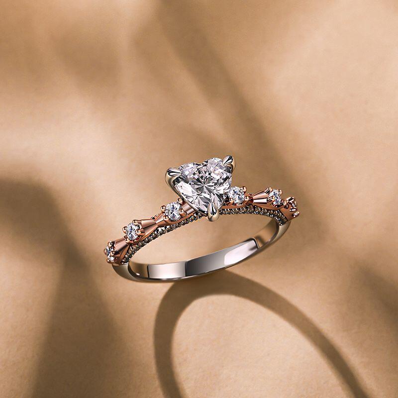 Wrap your finger in romantic charm with this Jeulia Two Tone Heart Shaped Engagement Ring. Featuring a glowing heart-cut stone nestled within a delicate bow knot design, this heart ring is crafted on a two-tone band that blends the polished sheen of silver with the warm glow of rose gold. Its slim, graceful silhouette is accentuated by a sparkling edge, harmonizing feminine whimsy with refined contrast. Perfect as an engagement symbol or an elegant daily accessory, this two tone bow ring captures the sweetness of love in every softly gleaming detail.