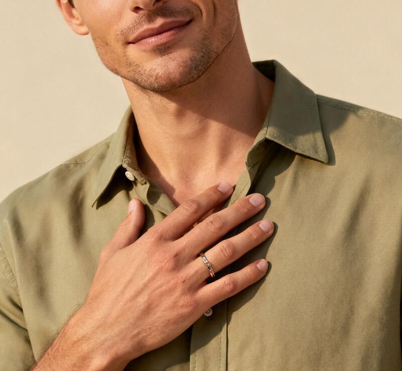 This Jeulia Two Tone Knot Men's Wedding Band reimagines the timeless symbolism of infinity through clean lines, transforming it into a modern knot that embodies connection and strength. The band's intricate interplay of gold and silver plating creates a sleek yet dynamic knot texture, showcasing the cool elegance of metal while subtly representing the resilient yet tender bond between two souls. The overall design is understated yet robust, with details revealing exceptional taste. This simple two tone wedding ring serves as both a solemn vessel for marital vows and a distinctive mark that expresses individuality and depth in everyday styling.